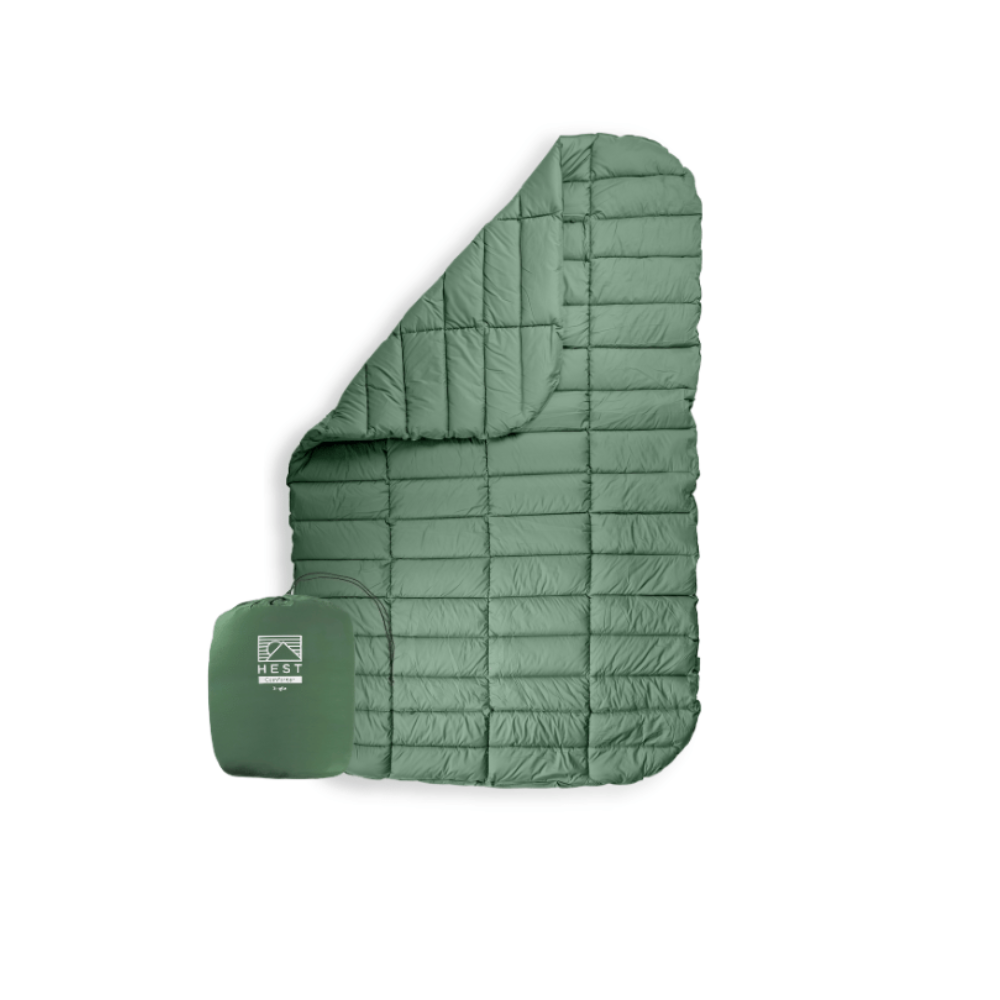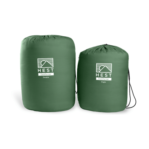 The HEST Comforter, offered in both a single and double size, is designed based upon the science of better sleep to provide the comfort and warmth of your home comforter in a packable, smart, outdoor ready design. The Comforter features 100% recycled polyester fill with no hot melt bonding, outdoor-ready-easy-to-clean fabric, and a clever cinch & tuck footbox design. The footbox keeps the comforter in place & supports thermoregulation throughout the night by allowing glabrous skin ( hands & feet) to easily stick out into fresh air and regulate your body temperature as needed for an optimal sleep experience outdoors. Unlike your traditional sleeping bag, your feet and hands can roam free of constriction! Smart features like top sheet loops and a cinch compression sack make the comforter easy to store, pack, & clean. Cozy up to the best outdoor comforter and sleep better with HEST.