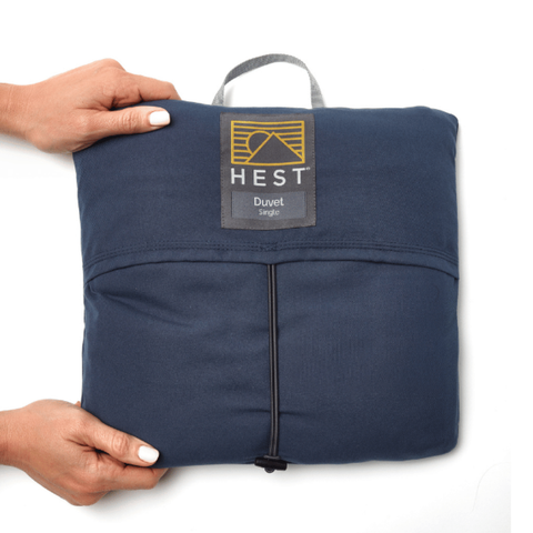 The HEST Duvet is the perfect companion for your HEST Comforter, designed to enhance your comforter’s durability, longevity and comfort. . Extend the life of your HEST comforter with this washable, outdoor ready duvet featuring a soft yet durable fabric. The duvet enhances your outdoor sleep setup with an extra layer of home-like comforter, luxury and convenience that turns any camping trip into a cozy retreat. Easy snap closure to access the comforter’s cinch and tuck footbox or quickly remove from your comforter and machine wash for your next adventure. Duvet tucks into an integrated pocket for easy transport and use as a pillow when not on your comforter.