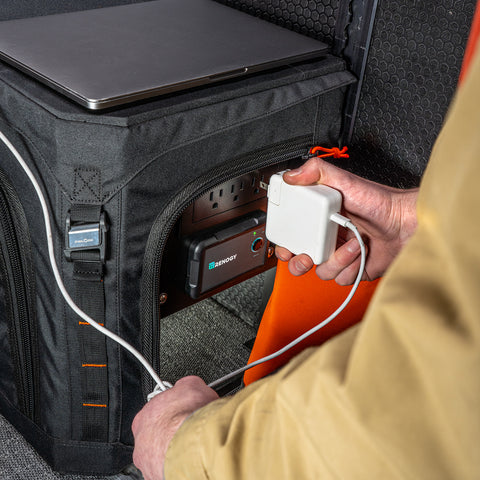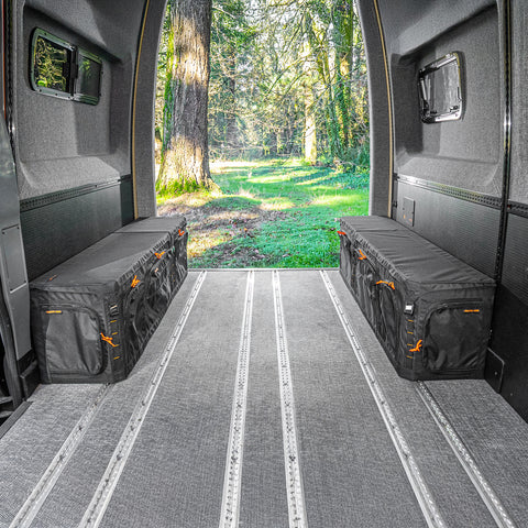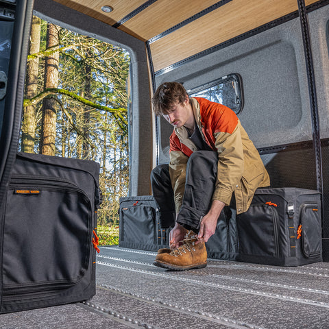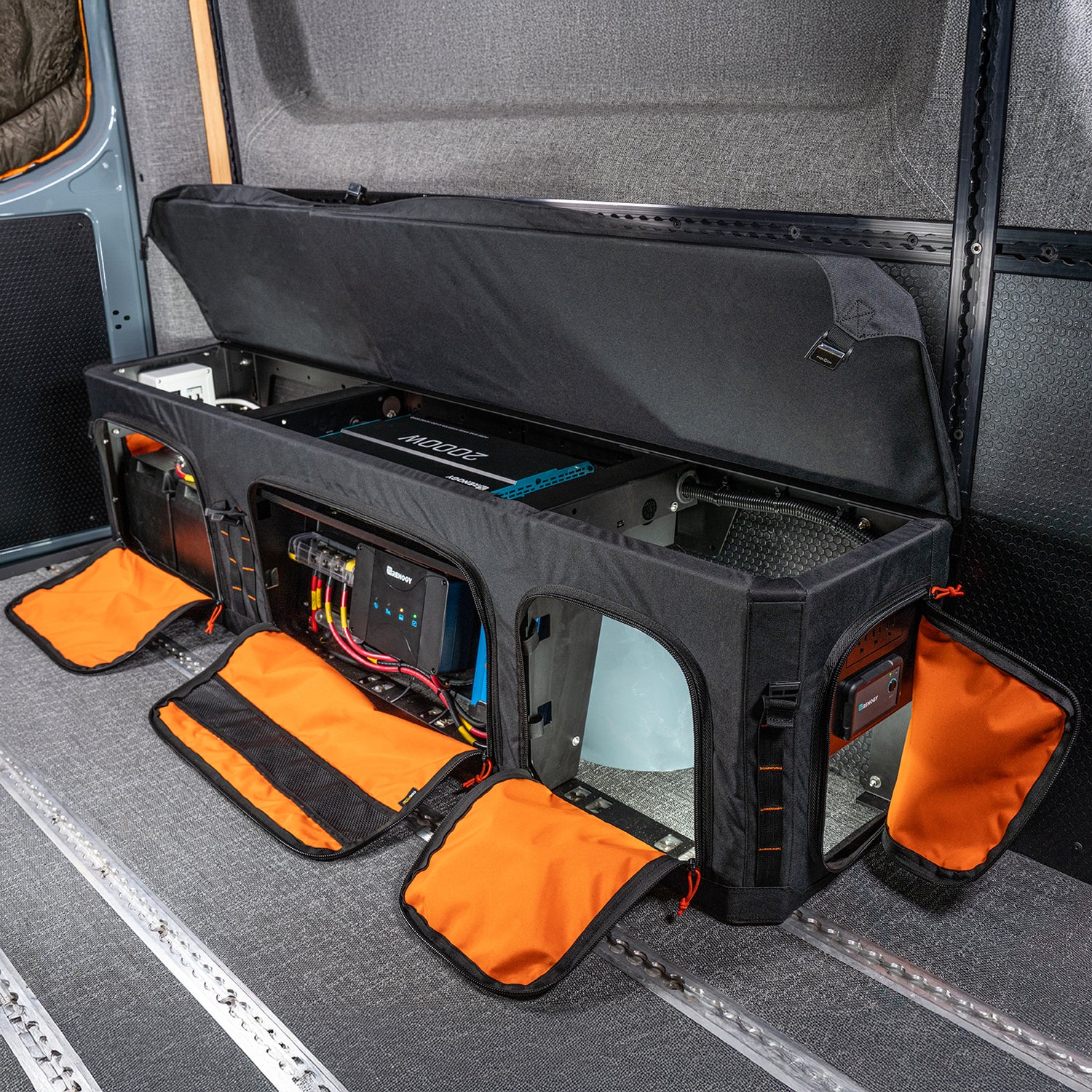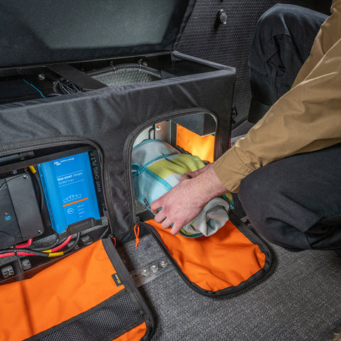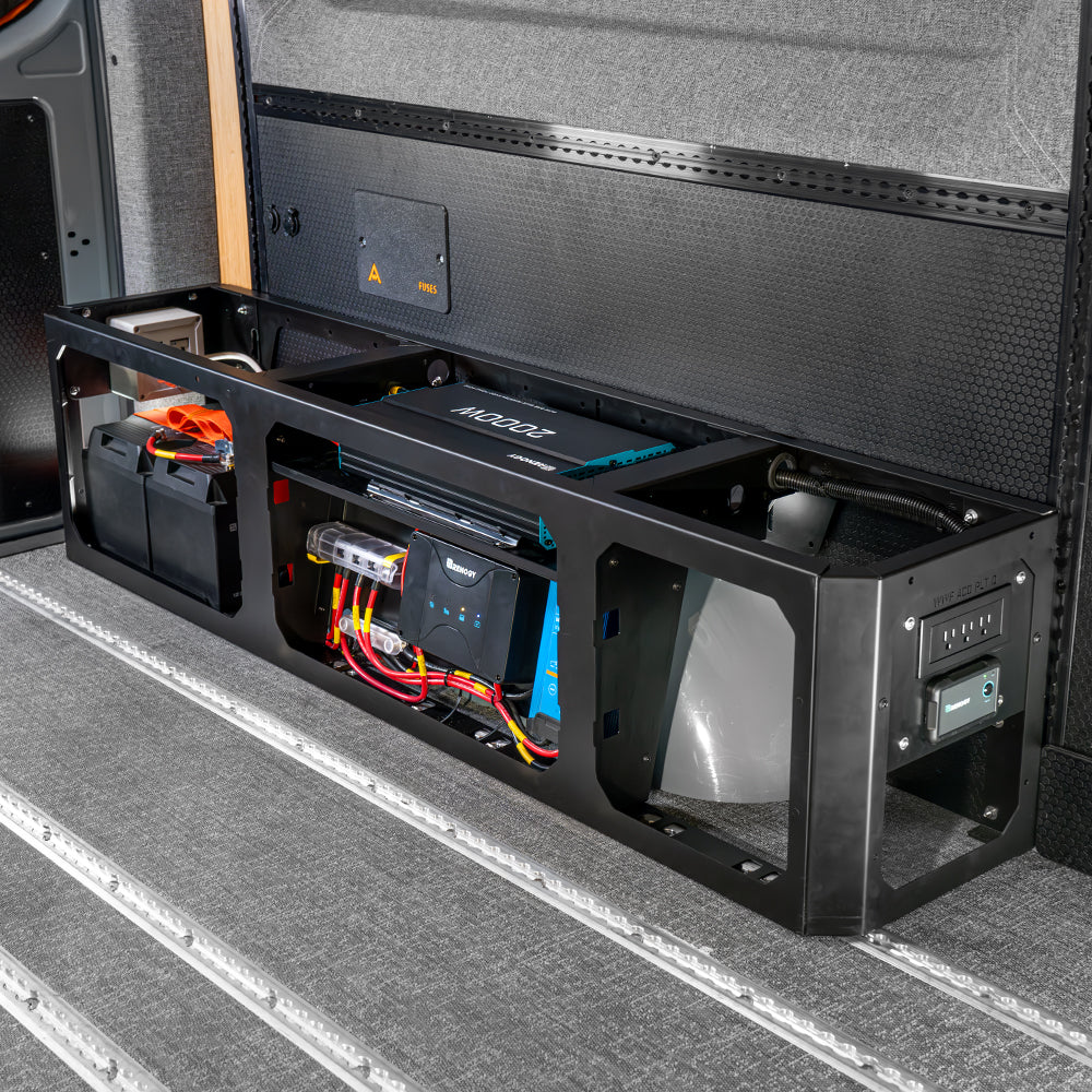 Housed in a GOAT Wheel Well Storage Locker, our new 200 Ah Electrical System integrates seamlessly with the Adventure Wagon cabin wiring harness. The system charges from your vehicle’s alternator, and has options to add solar charging, shore power, and a 120V inverter for a complete and versatile power source. These options can be added at the time of purchase, or over time as your van build evolves.