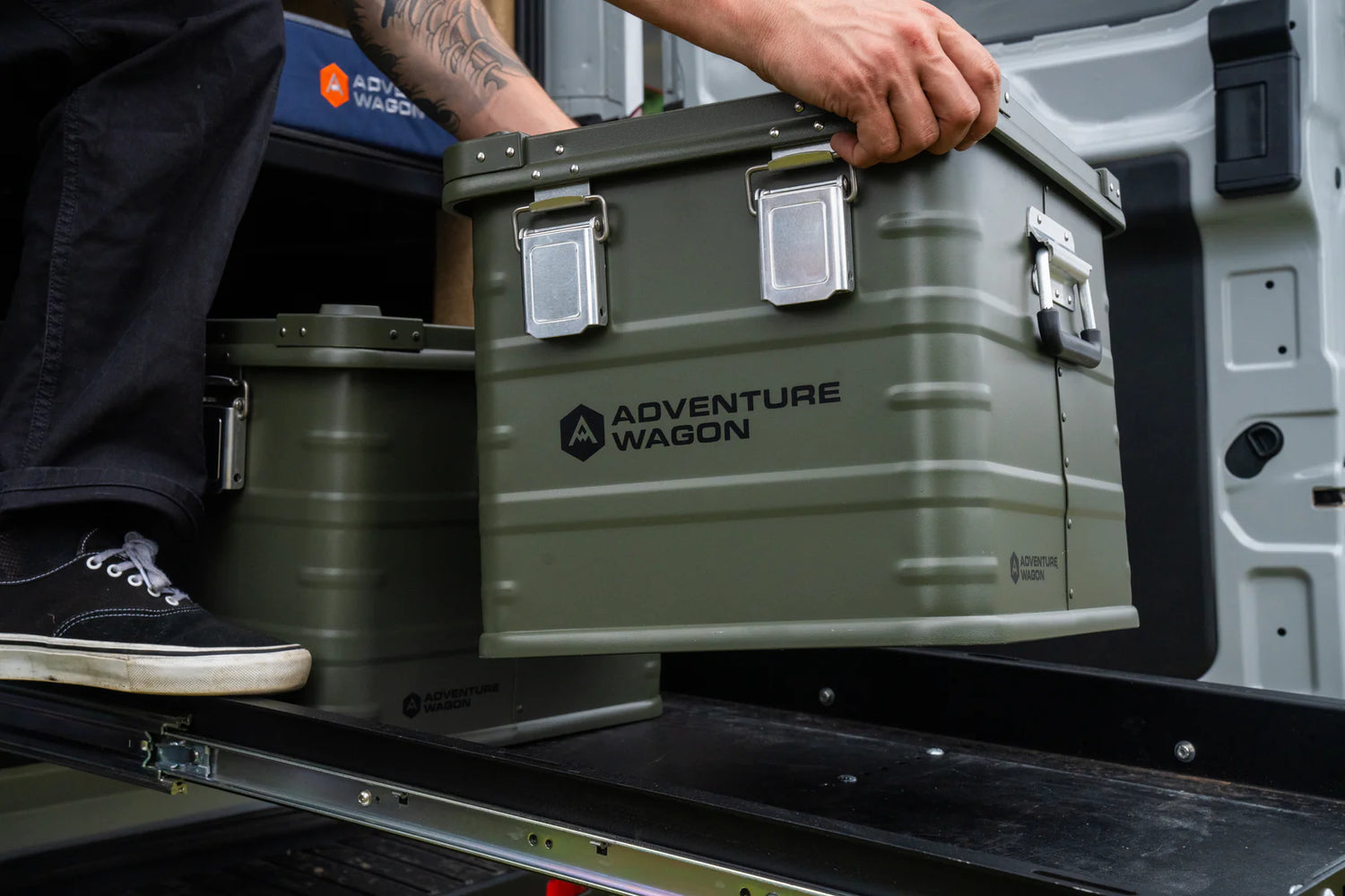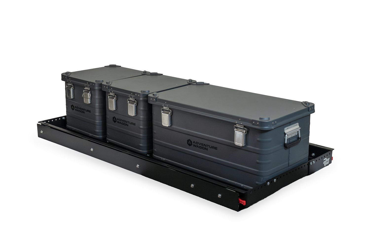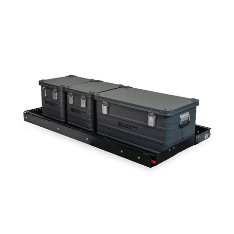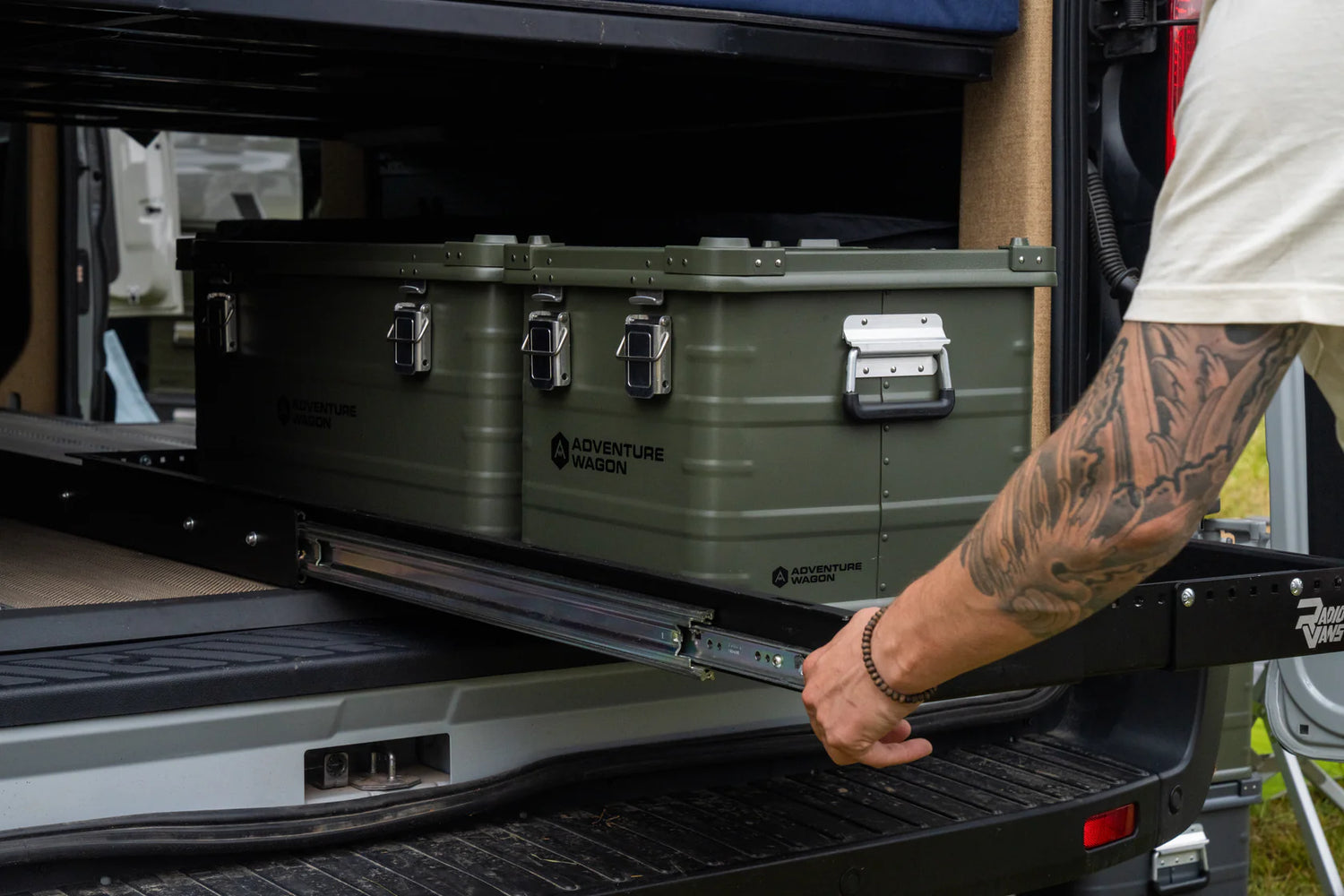 The Gear Garage Bundle is the ultimate solution to organizing and accessing your gear—no more crawling into the back of your van to search for rogue items. The AUX Box powder-coated aluminum cases keep your gear organized in an area that can easily be accessed via the Wave slide-out tray. The boxes were designed to perfectly fill the 60" tray using different combinations of the three sizes. Add the Radar Gear Wall (optional) to maximize the usable space in your bed and use the included Deluxe Strap Kit to secure items to the tray and wall. Additional AUX Boxes can be purchased here.