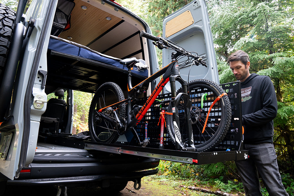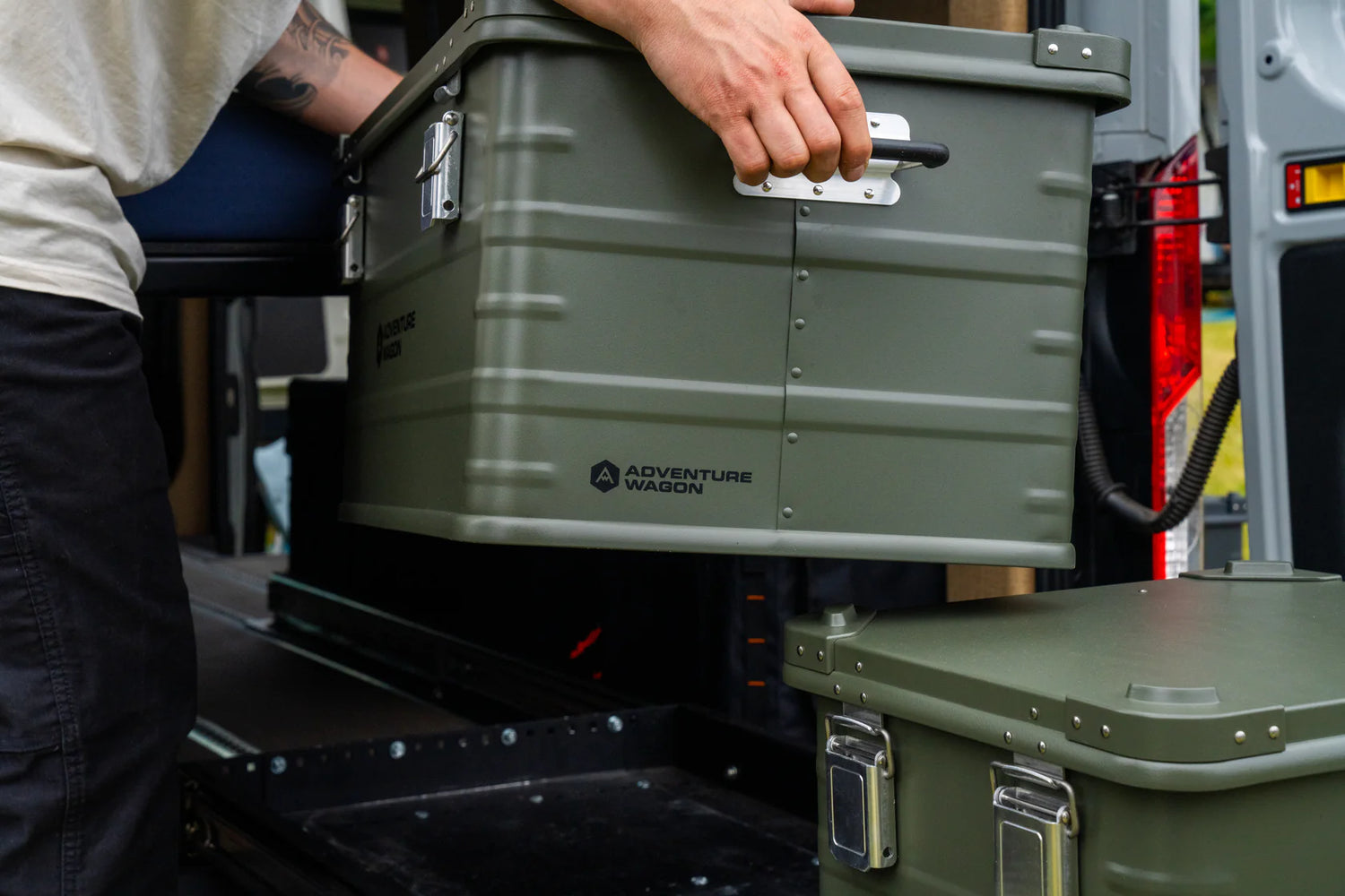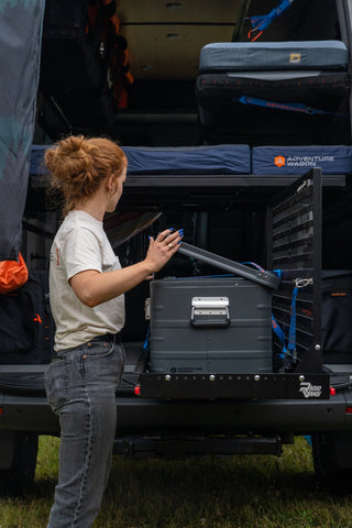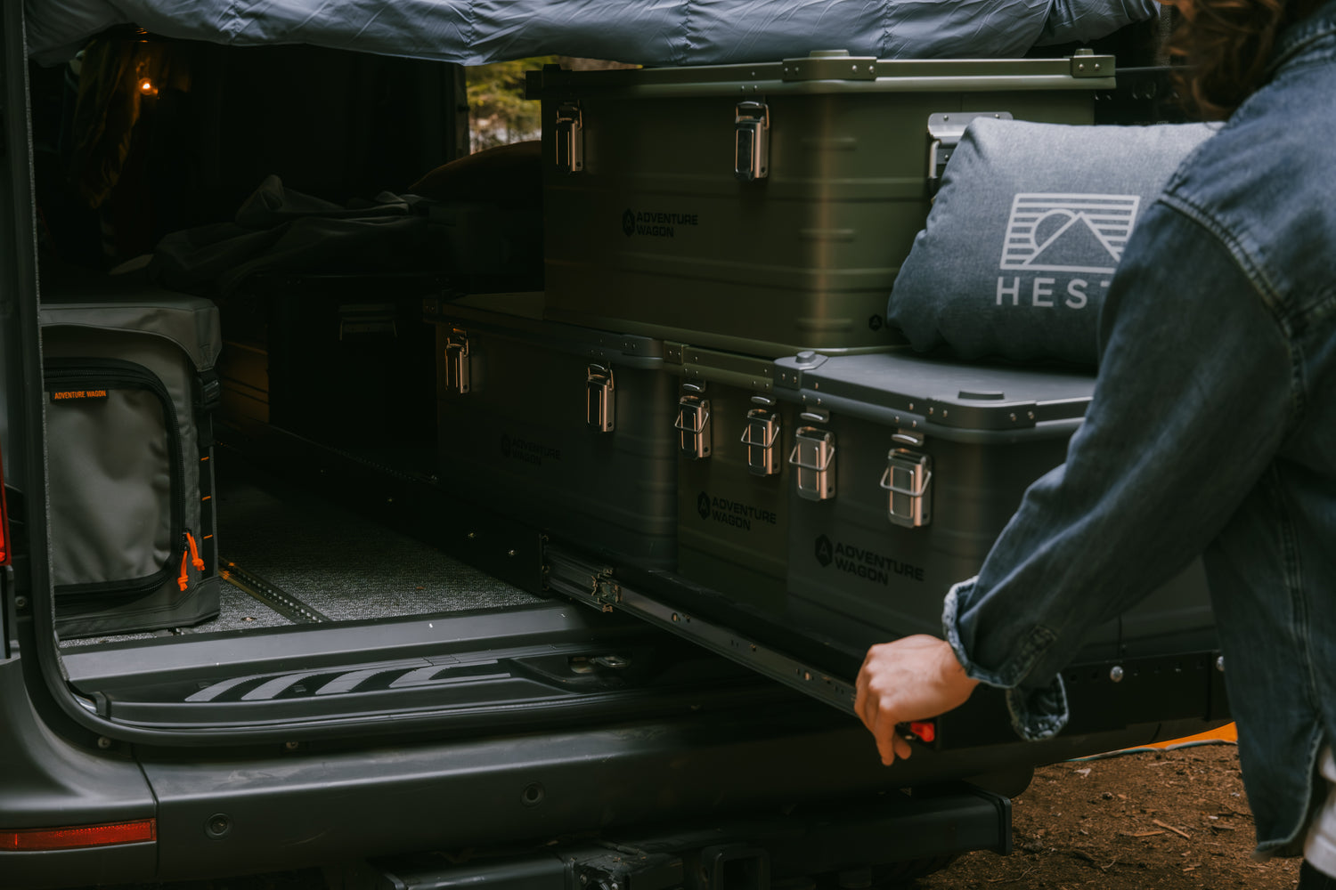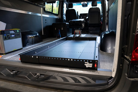 The Gear Garage Bundle is the ultimate solution to organizing and accessing your gear—no more crawling into the back of your van to search for rogue items. The AUX Box powder-coated aluminum cases keep your gear organized in an area that can easily be accessed via the Wave slide-out tray. The boxes were designed to perfectly fill the 60" tray using different combinations of the three sizes. Add the Radar Gear Wall (optional) to maximize the usable space in your bed and use the included Deluxe Strap Kit to secure items to the tray and wall. Additional AUX Boxes can be purchased here.