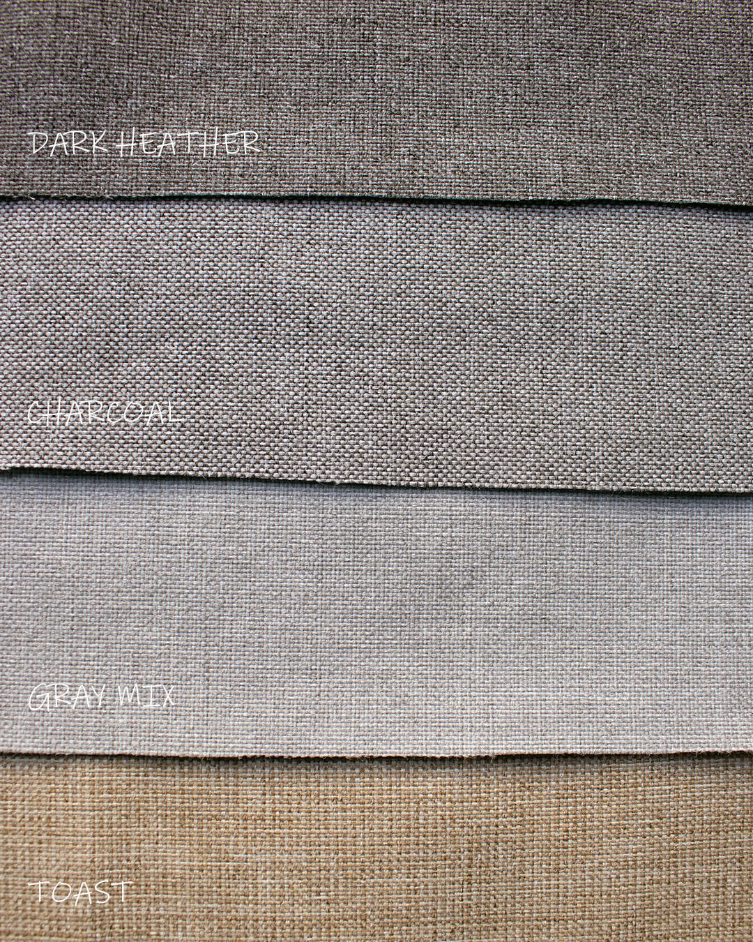 - Grey Heather, Grey Mix, Charcoal and Toast (light tan)