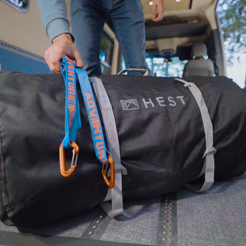 The Soogan Bunk combines the Hest Sleep System inflatable drop-stitch base (think SUP) and foamy mattress with a supportive sling made from rugged Cordura Recor recycled fabric. It hangs from the ceiling and wall of your Adventure Wagon and can be raised, lowered, or folded up to maximize space.