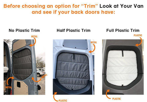 Our Zippered Rear Door Shades attach magnetically to the window frame, offering complete privacy and temperature control for your van. Featuring dual-side zip access for convenient eye-level window views, they’re designed for comfort and practicality wherever you travel. Please double-check your van’s rear door trim (“no plastic trim,” “half plastic trim,” or “full plastic trim”) before purchasing, as installation methods differ by trim type.