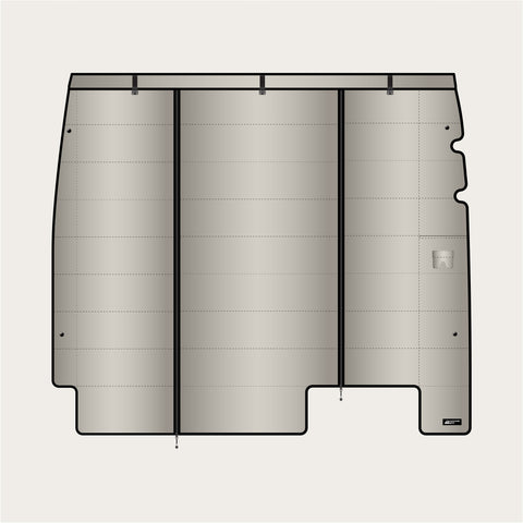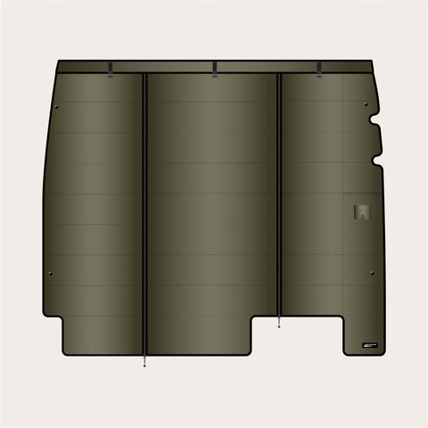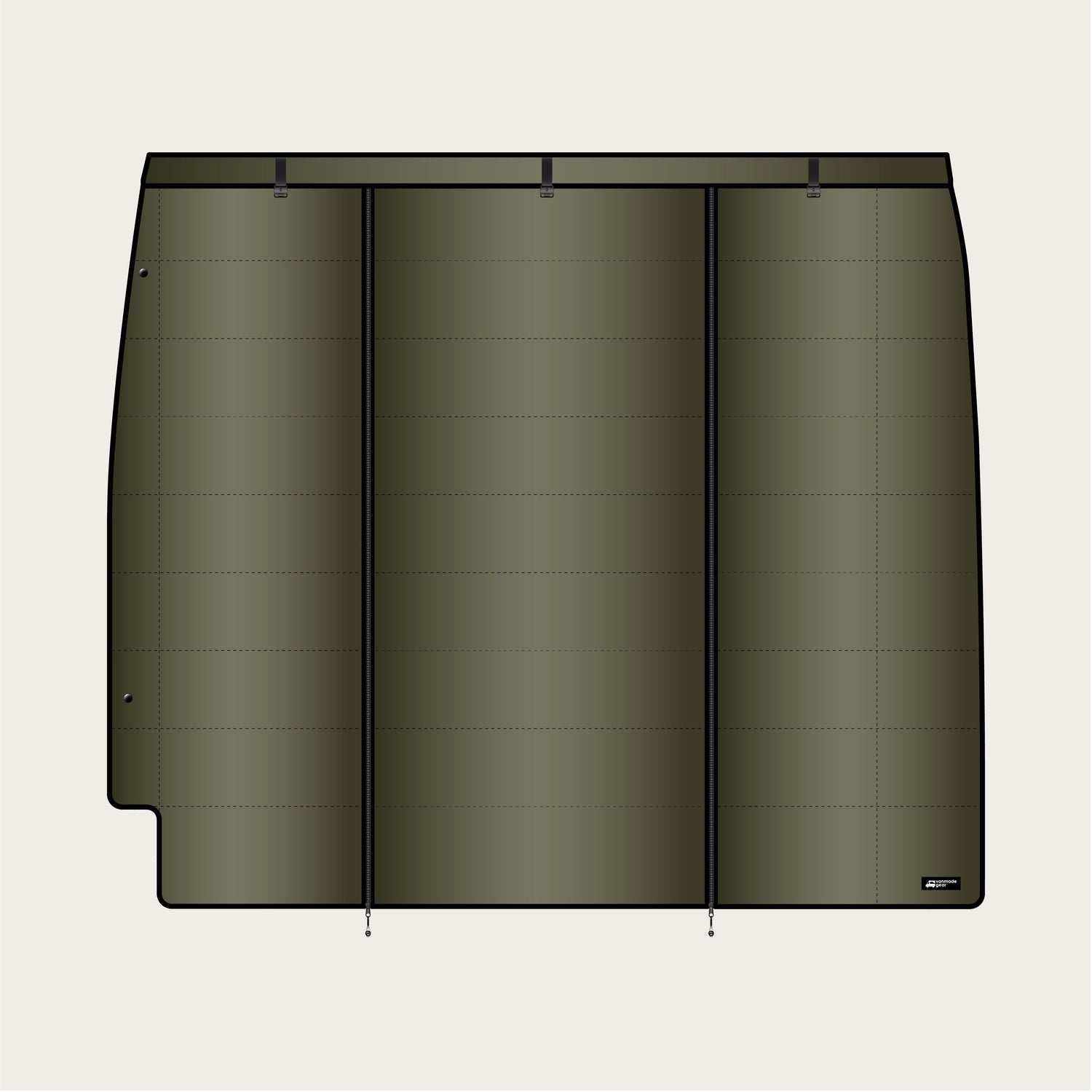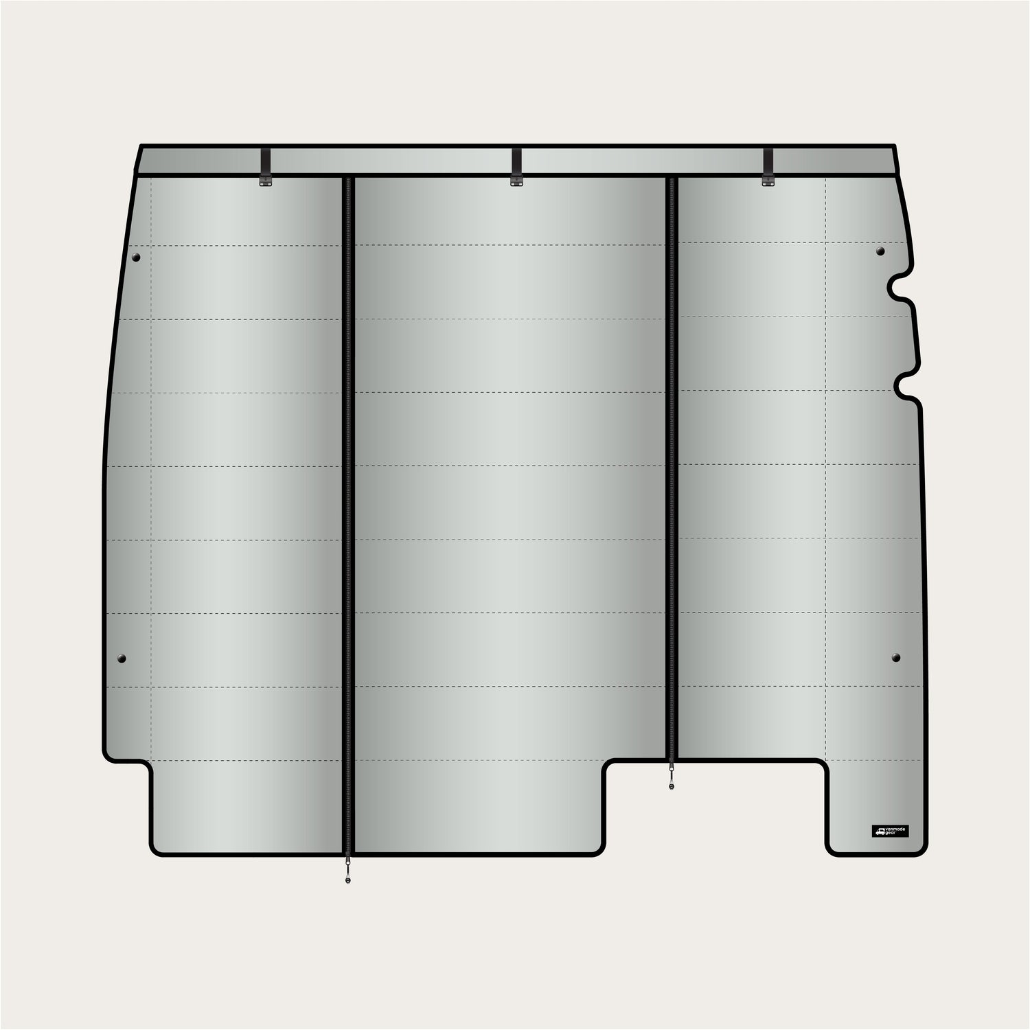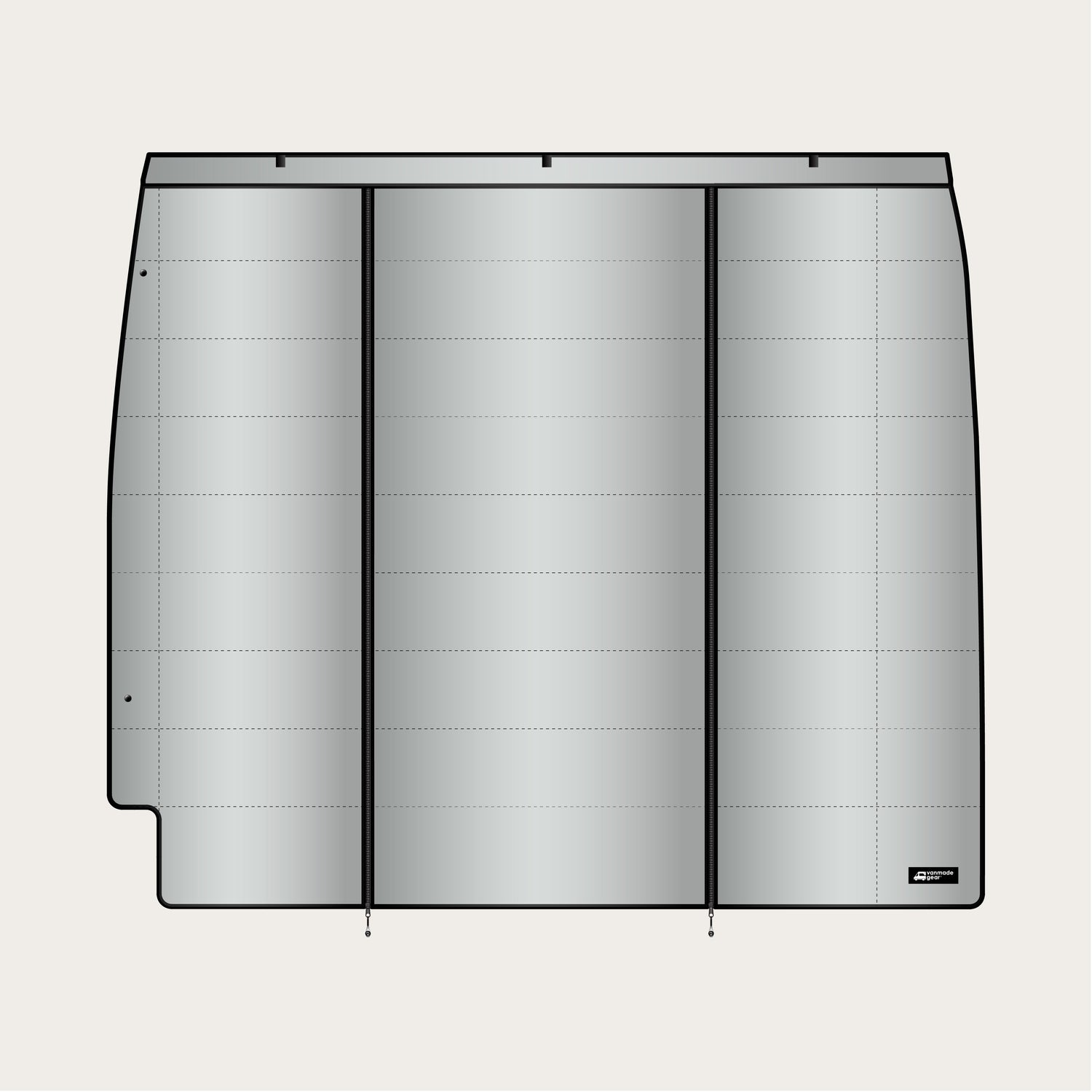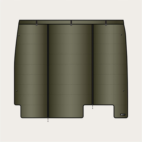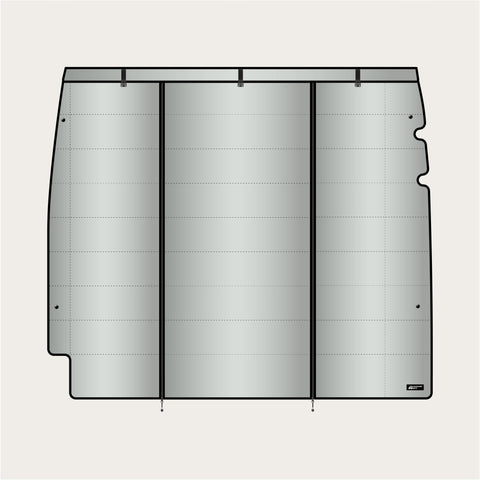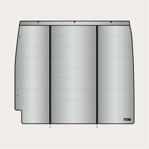 This insulated three-panel divider deploys instantly using a Fidlock™ magnetic catch for a complete light and sound seal between the cab and the living area. It significantly improves temperature control, HVAC efficiency, and driving comfort—while rolling up neatly when not in use.